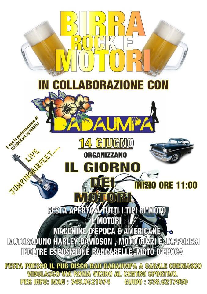 (4/17/2014, 0:38)Birrarock e motori con il Discobar Dadaumpa il 14 giugno organizza il giorno dei motori. Un party aperto a tutti, dove troverete esposizione di auto e moto d'epoca, american cars. ..musica live con i JumpingairFeet, la partecipazione di MaxJD con la sua musica rock. Stand e per i più spericolati ci sarà il simulatore di guida professionale. Naturalmente non mancherà la carne alla griglia e la birra a volonta...(aperto a tutti i tipi di moto ) vi aspettiamo ragazzi....a casale cremasco vidolasco (cr) via roma vicino al nuovo centro sportivo