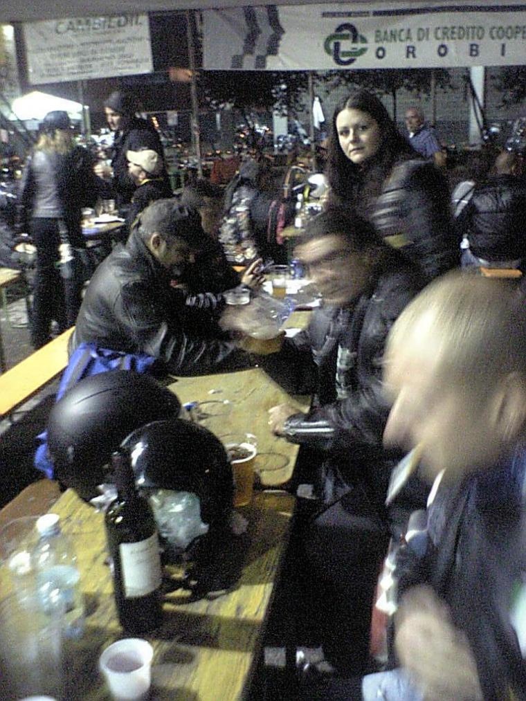 Nota dolente la pioggia. Un vero diluvio che però non ha rovinato la festa, grazie alla bella tenso struttura messa a riparare i partecipanti al raduno. Nota di merito anche a bar e cucina ove si trovava praticamente di tutto e di ottima qualità. Meno fortunati i commercianti delle bancarelle di oggettistica bikers, costretti a tenere per molto tempo chiusi i loro tendoni per via della pioggia che non ha impedito però a qualche "fegatoso" di esibirsi in fumosi bourn out, ma ha impedito però a me di recarmi nella mia tenda, messa nello spazio concessoci dall'organizzazione per il campeggio, dotato di ottimi servizi igenici... Sì, ho dormito sulla panchina sotto al tendone ma anche queste sono belle esperienze e ne è valsa la pena data la bella riuscita del raduno.