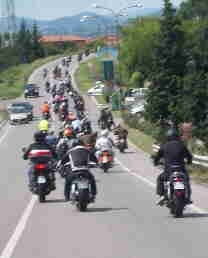 Non avevamo fatto neanche 300 metri che da lontano comincia a sentirsi un rombo crescente in avvicinamento..... tempo due secondi ed ecco spuntare da una traversa a mezzo km da noi un vespaio di moto meraviglioso.... saranno state più di mille motociclette..... avete presente la scena del film "Renegade - un osso troppo duro" con Terence Hill quando alla fine arriva un gruppo di motociclisti a salvarlo da un linciaggio? precisa: prima i rombi, poi la polvere ed infine le moto..... uno spettacolo molto suggestivo..... da pelle d'oca.... ho partecipato a svariati motogiri ma così tante moto in movimento tutte insieme non le avevo mai viste.....