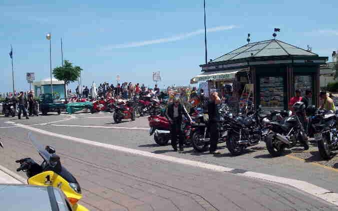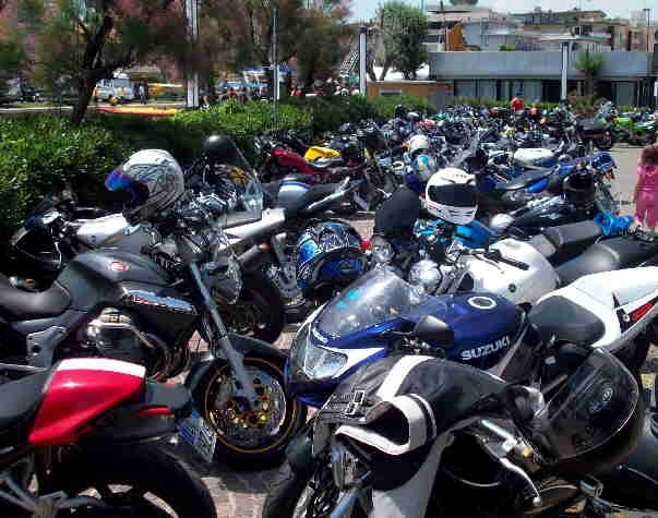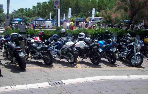 Sono passato a prendere la mia "zavorrina" e ci siamo diretti verso Rimini.... arrivati a Bellaria sapevo che il motoraduno si trovasse a non più di un km da me, solo che non sapevo con esattezza dove, così mi sono fermato sul ciglio della strada nella speranza di veder passare gruppi di moto ai quali accodarmi per raggiungere il parco..... Avete presente le comiche? UGUALE: per ogni gruppo che andava a destra ce n'erano due che andavano a sinistra e viceversa..... un gruppo di ragazzi si ferma vicino a me piuttosto disorientato e mi chede se sapevo dove si trovasse il motoraduno..... "Ragazzi stavo per chiedervelo io", dissi.....