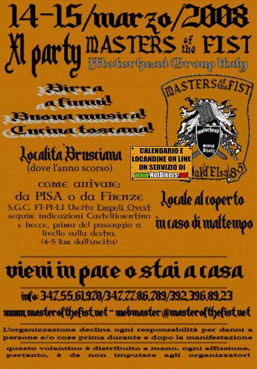 (2/17/2008, 9:21)SIAMO STATI BENISSIMO IN POCHE PARELE ALLA FINE NON E CHE SIA UN MOTORADUNO MEGA MA E QUELLO CHE ALLE VOLTE SERVE STARE IN COMPAGNIA CON VERI AMICI BRINDARE MANGIAre musica ecc.... CONSIGLIO SE CI DOVESSI VENIRE PORTA CON TE PANE E SALAME ECC.... VEDRAI CHE L'AMICO L'HO TROVI IN SALUTO AI MASTERS
