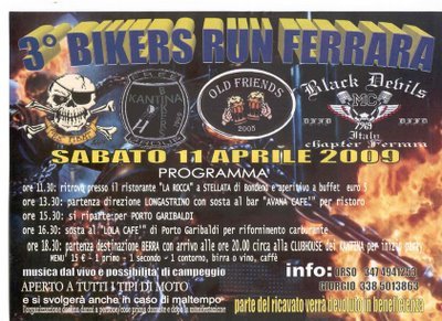 (4/29/2009, 21:51)Tutto molto bello soprattutto la massiccia partecipazione dei bikers,volevo ringraziarvi tutti . lo scopo del run era di raccogliere soldi da donare ad una bambina affetta da una malattia rara,che necessita di terapie particolari e costose,grazie al vostro aiuto ci siamo riusciti.GRAZIE GRAZIE GRAZIE con rispetto BULLO .KANTINA BIKERS FREE GROUP