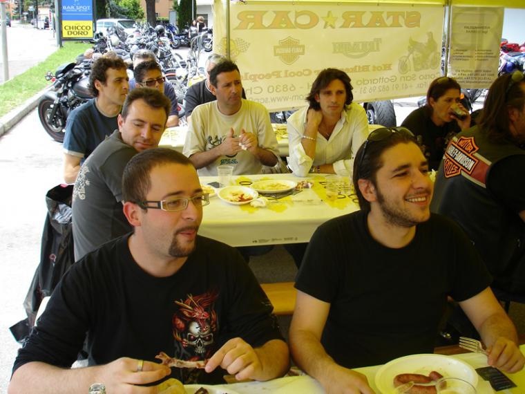 La griglia sta già lavorando a pieno ritmo, in tutta la giornata non si creerà nessuna coda per poter mangiare, benché la partecipazione sia buona e numerosa, i ragazzi e le ragazze che si occupano della preparazione dei cibi e delle bibite sono molto efficenti e non perdono un solo colpo, con gentilezza e cortesia servono birre, bibite diverse, costine, salsicce, ecc. ecc. e tutto gira in modo perfetto. Mentre Bestia, Bikerozzo e Nihal decidono di magiare qualche cosa, Max ed io andiamo a scattare qualche foto di moto, ce ne sono di stupende.