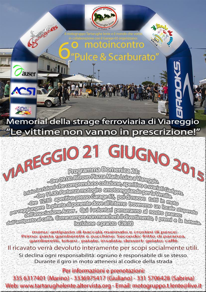 Biker!!! Non sai dove andare??? Ti aspettiamo al sesto motoincontro "Pulce & Scarburato", il 21 Giugno 2015, di meglio è difficile trovare e con voi due amici vogliamo ricordare... Per la Versilia andiamo a smotoreggiare, l'aperitivo non puo' mancare e all'una tutti a mangiare!