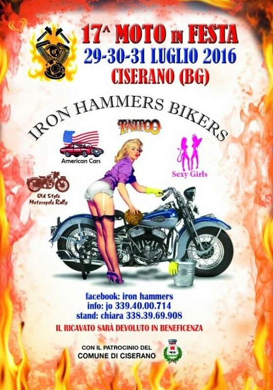 17'MOTORADUNO Ciserano Bergamo il motoraduno apre alle 15 di venerdi 29 luglio con cucina tipica bergamasca birra e musica Live sabato 30 il rombo delle due ruote prosegue con musica dal vivo rock n roll cucina fiumi di birra bike show premiazioni gruppi e per finire sexy girl ! ! ! la domenica mattina 31 come tradizione il motogiro nei paesi limitrofi con il ritorno alla festa per musica Live e pranzare in sieme per la chiusura dell evento... vietato mancare vasta area camping zona industriale piazza Milano